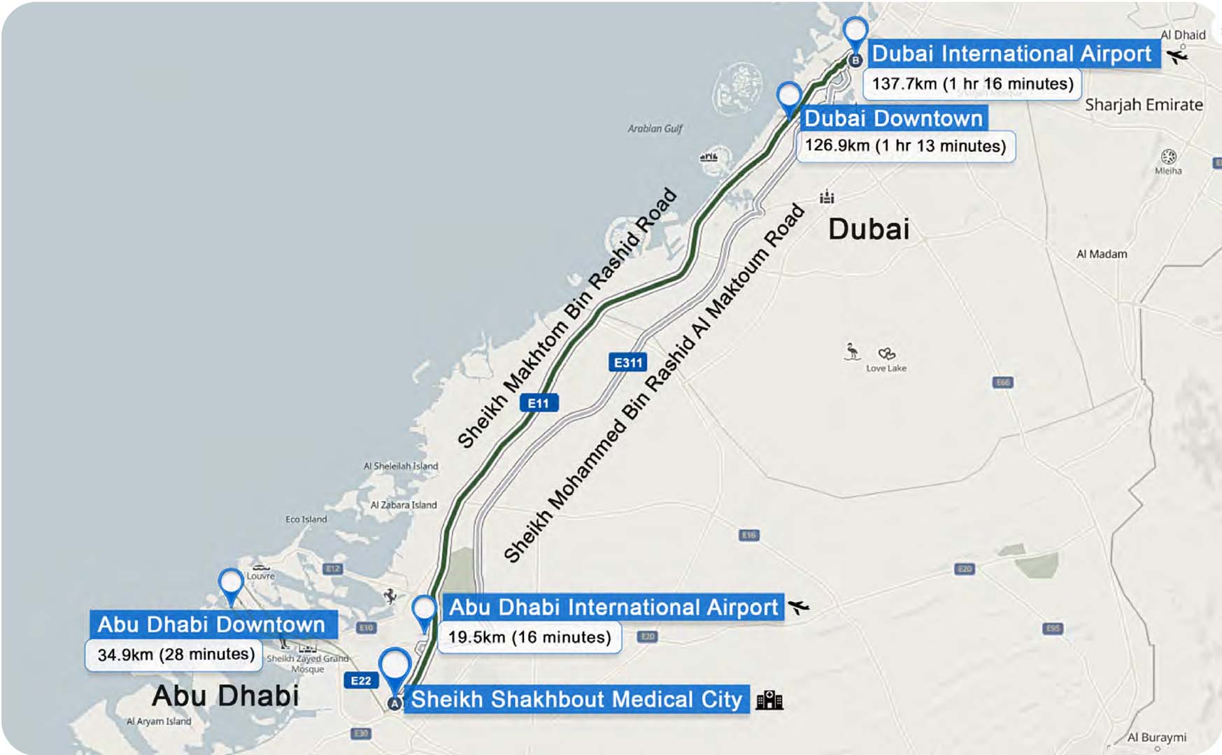 Sheikh Shakhbout Medical City (SSMC) is located next to E11 and E22 with easy access to Zayed International Airport. The hospital is approximately 30 minutes away from Downtown Abu Dhabi and 90 minutes away from Dubai’s city centre.